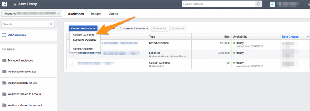 Once you’re on the Audiences screen, you’ll need to click the blue ‘Create Audience’ button and select ‘Custom Audience’.